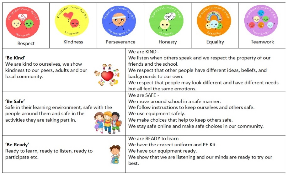 At our school, we focus on developing positive behaviours for learning and successful relationships. We aim to provide a consistent, positive approach to empower children to take responsibility for their actions and to behave in a socially acceptable way. We value parental support and ask that you help and encourage your child to show the schools values and behaviour rules to behave appropriately. In the picture below you will see our 6 values and our 3 school rules; Be Kind – Be Safe – Be Ready.